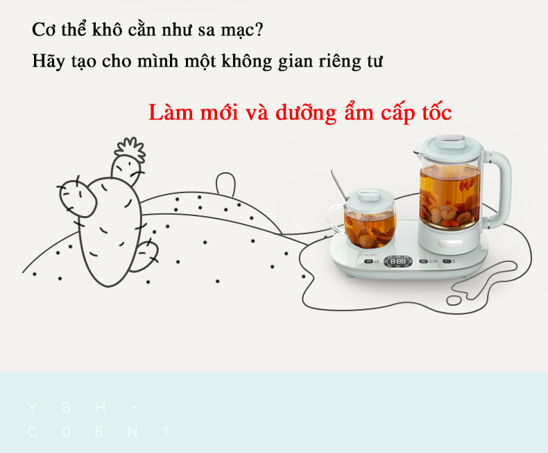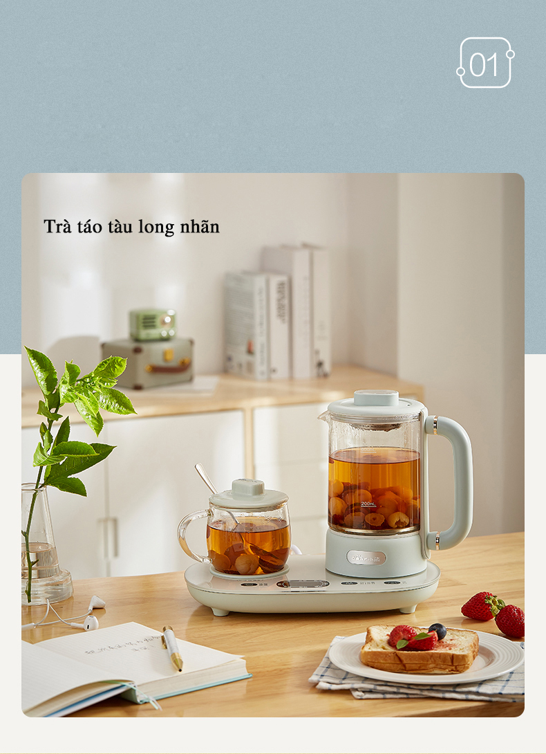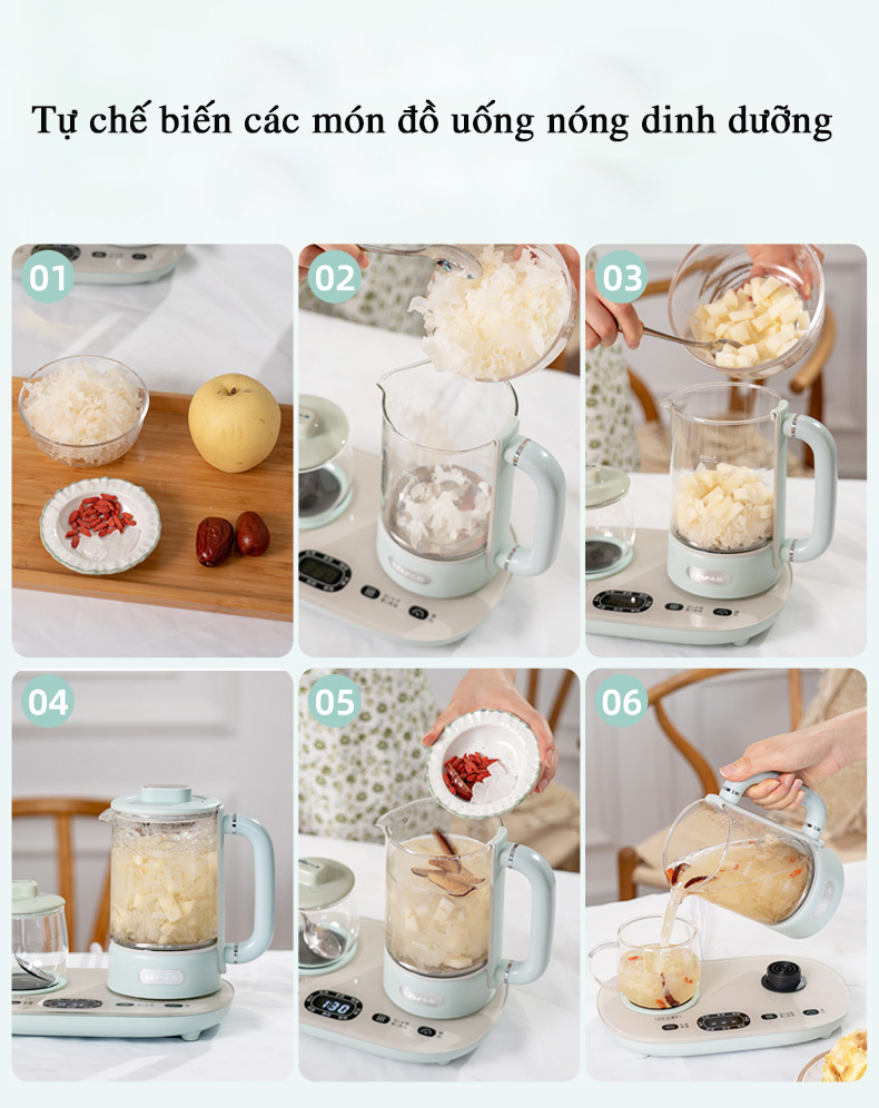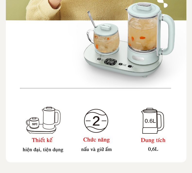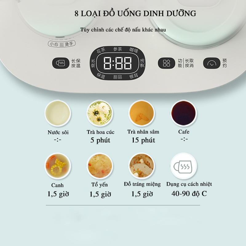 Ấm đun nước, pha trà đa năng Bear được trang bị một loạt các chức năng đa dạng để đáp ứng nhiều nhu cầu khác nhau. Với tổng cộng 8 chức năng khác nhau, sản phẩm này thực sự mang đến một trải nghiệm đa dạng cho người dùng. Các chức năng bao gồm: Đun sôi nước/pha trà thơm/trà nhân sâm/cà phê/súp/chưng tổ yến/làm món tráng miệng/bảo quản nhiệt. Sản phẩm không chỉ hỗ trợ việc đun sôi nước, mà còn cho phép bạn nấu các loại thức uống khác nhau như trà thơm, trà nhân sâm, cà phê, súp, chưng tổ yến, món tráng miệng và thậm chí cả việc bảo quản nhiệt cho các loại thức ăn.