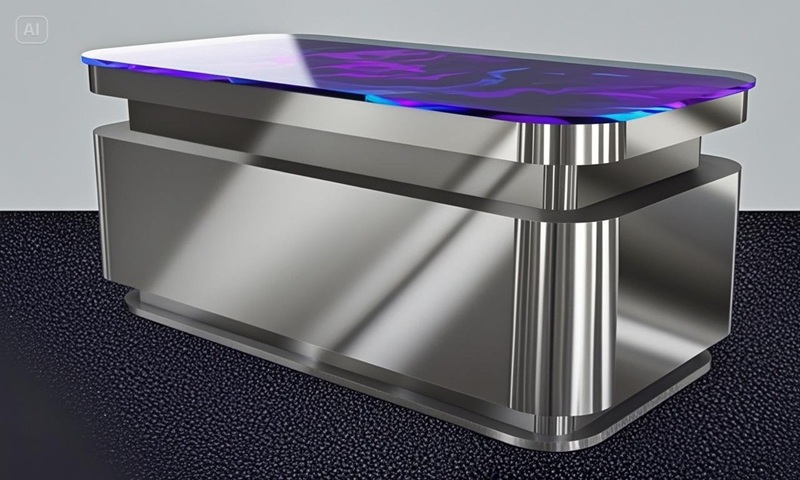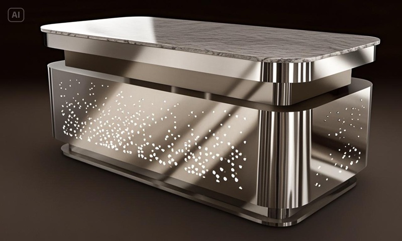 🔆Thân bàn được chế tác từ inox mạ titan ánh kim, phản chiếu ánh sáng lấp lánh, vừa sang trọng vừa bền bỉ.