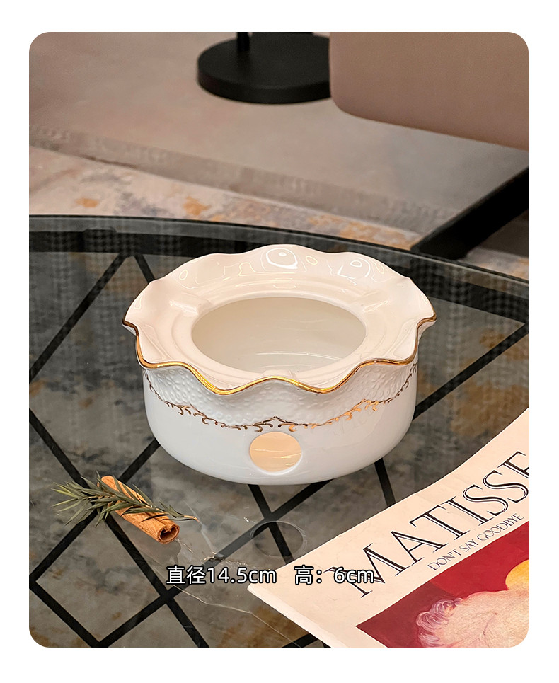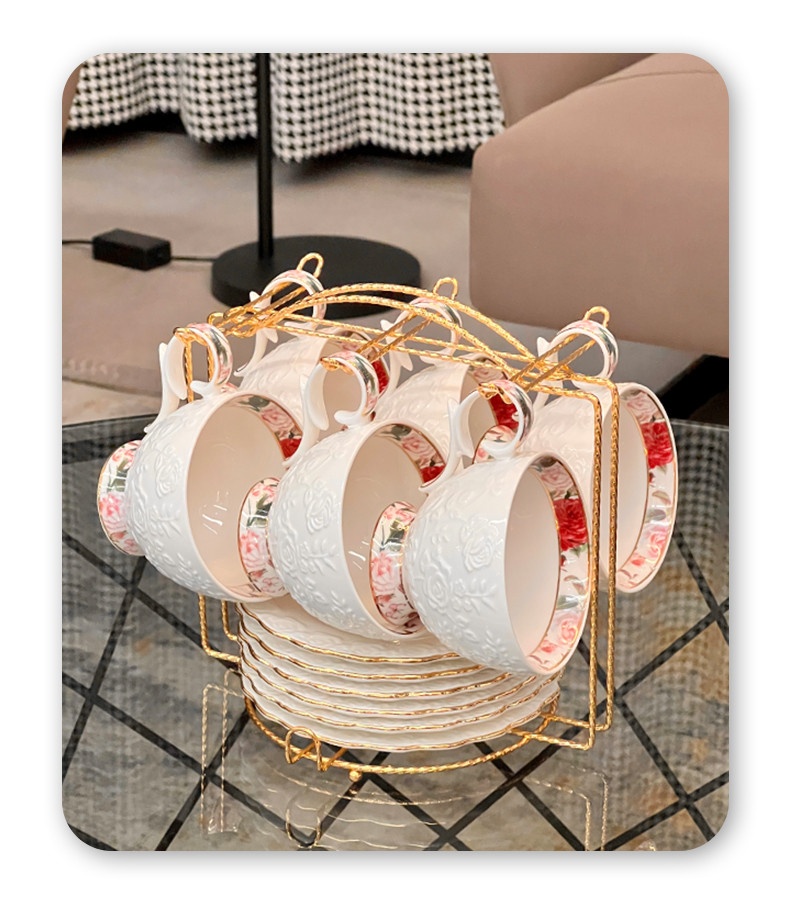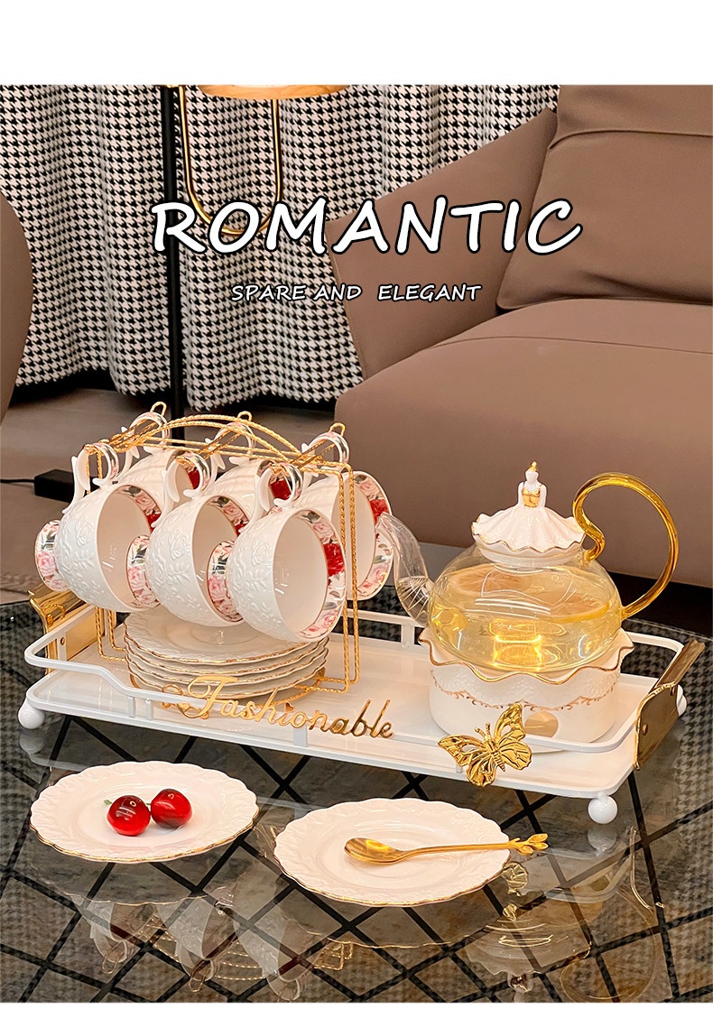 Bộ ấm trà Hoàng Gia BATH sử dụng tông màu trắng chủ đạo tinh tế và thanh lịch. Giá đỡ giúp treo những chiếc cốc gọn gàng và ngăn nắp. Đi kèm đó là 6 đĩa để đặt cốc khi uống nước. Khay bằng kim loại phủ sơn tĩnh điện trắng có thiết kế sang trọng. Có hai kiểu ấm là thuỷ tinh trong suốt và gốm sứ nung, trong đó loại ấm thuỷ tinh có thêm đế gốm nung ở nhiệt độ cao có thể đặt nến bên trong để hâm nóng trà.