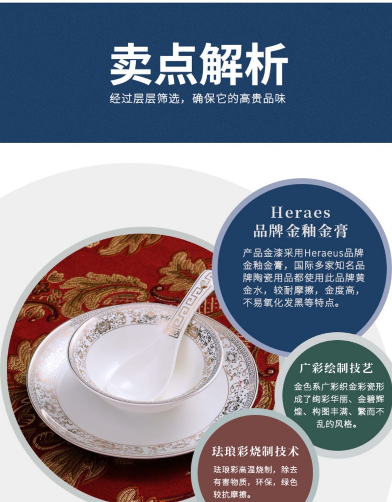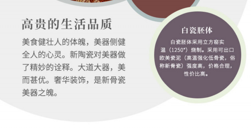 Màu men được nung ở nhiệt độ cao loại bỏ các chất độc hại và thân thiện với môi trường. Thân sứ trắng nung trong lò lập phương ở nhiệt độ 1250°C. Phần phôi sứ sử dụng đất sét Châu Âu và Mỹ có thể xuất khẩu với độ bền cao và dễ dàng vệ sinh. Bộ sản phẩm được làm thủ công mỹ nghệ, mang hình thức cao quý và sang trọng.