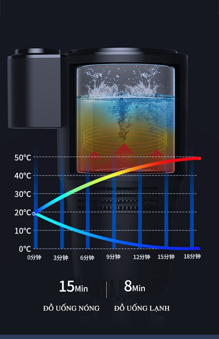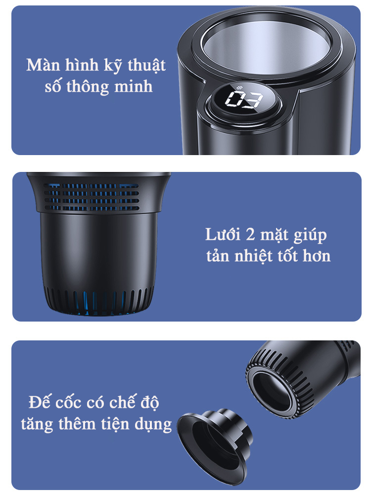 Cốc giữ nhiệt trên xe ô tô có khả năng hâm nóng đồ uống chỉ trong vòng 8 phút (nếu đựng đồ uống trong bình chứa theo hướng dẫn của nhà sản xuất). Bạn có thể làm nóng đồ uống lên đến 60°C trong 8 phút, hoặc làm lạnh đến mức thấp nhất 0°C trong vòng 15 phút. Điều này giúp tiết kiệm không gian và năng lượng.