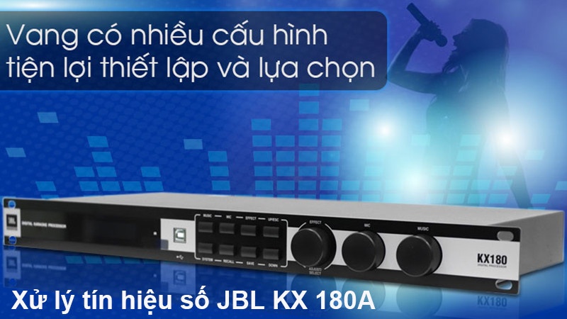Xử lý tín hiệu số JBL KX 180A sở hữu 2 nhóm đầu vào microphone độc lập PEQ 15 băng tần cho vào đầu Music. Mỗi đầu mic được trang bị ba cấp độ chống hú (anti-feedback). Thiết bị có khả năng kiểm soát độc lập tiếng vang (rerveb) và tiếng hồi (echo).