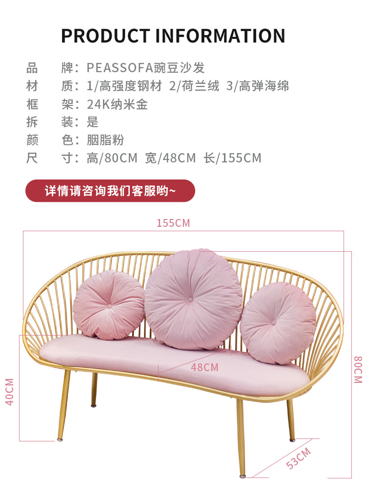 Phần khung và chân ghế sử dụng hợp kim cao cấp mạ vàng nano 24K. Các mối nối hàn ứng dụng công nghệ đánh bóng giữ cho ghế luôn chắc chắn và có tính thẩm mỹ. Để giống với những hạt đậu Hà Lan, mẫu ghế GSPN thiết kế 3 ghế tựa lưng hình tròn cho bộ sofa thêm sinh động. Màu gối sẽ cùng tone màu với ghế để tạo nên sự đồng nhất trong không gian, đồng thời đem lại trải nghiệm thoải mái cho người ngồi.