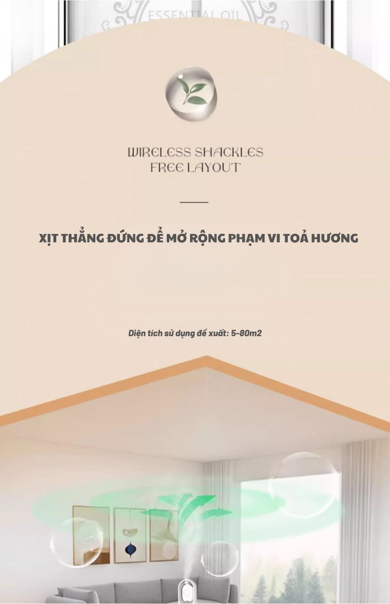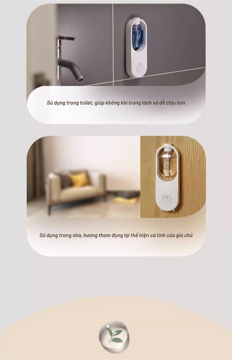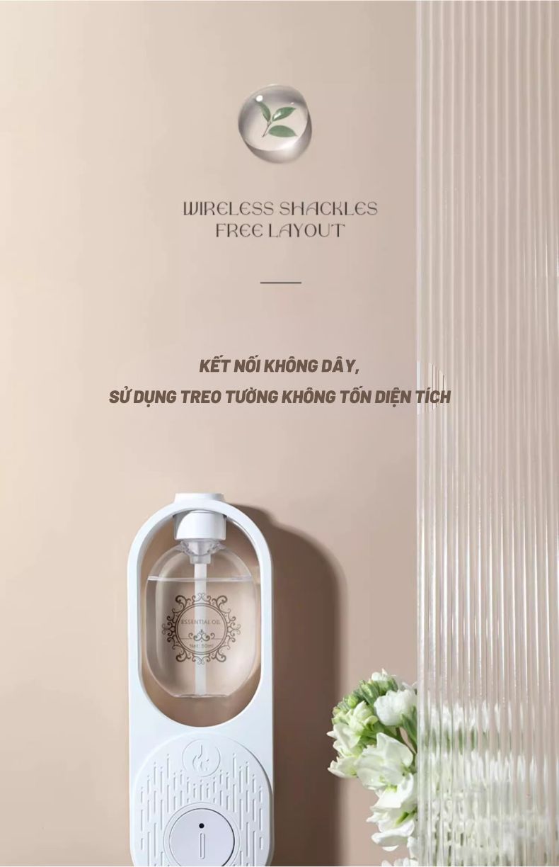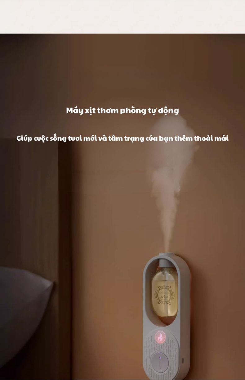 Máy xịt thơm phòng tự động có thiết kế linh hoạt, giúp người dùng có thể gắn lên tường hoặc để trên bàn tùy theo sở thích và không gian. Với khả năng hoạt động không cần cắm điện trực tiếp, máy sẽ tự động xịt thơm theo các chế độ đã được cài đặt trước. Với chức năng khuếch tán tinh dầu từ nước hoa xịt phòng, bạn có thể yên tâm về việc máy không chỉ mang lại mùi thơm mà còn có tác dụng tương tự như máy xông tinh dầu.