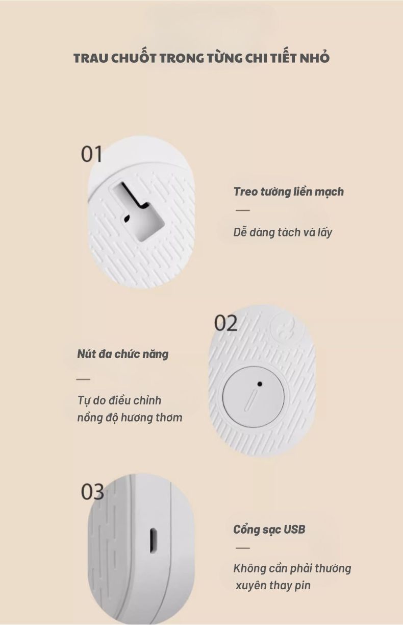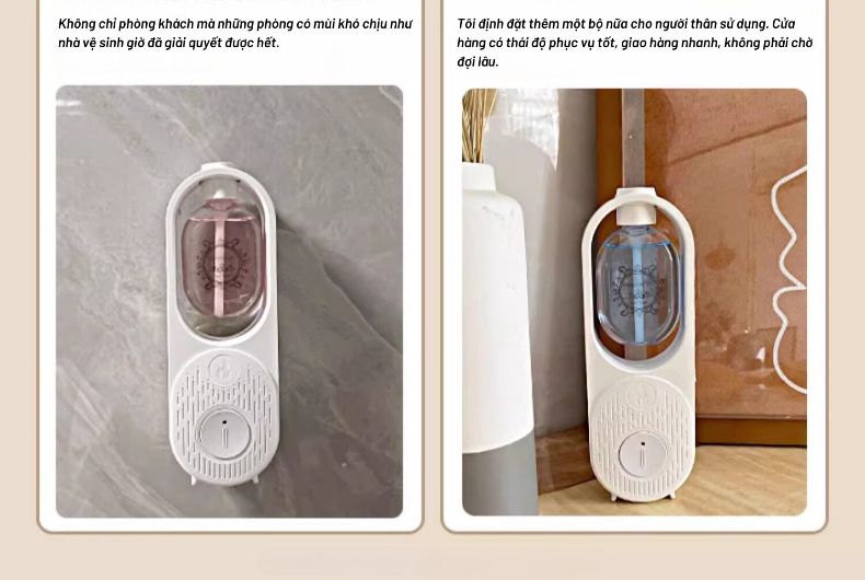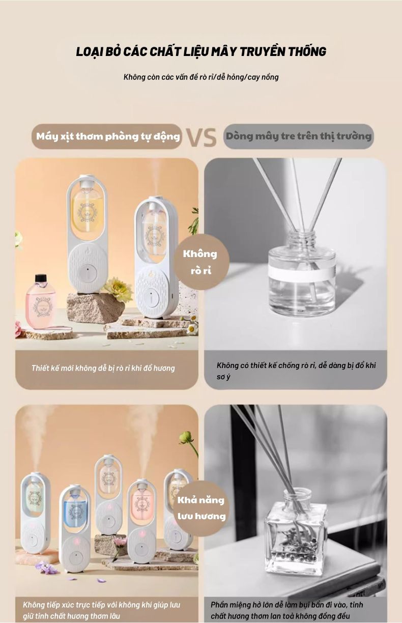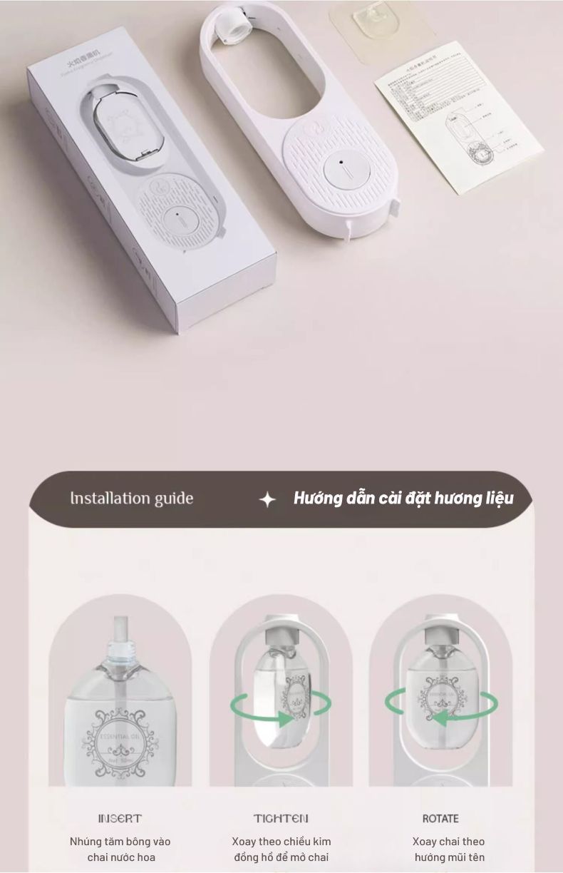 Máy xịt thơm phòng tự động có thiết kế linh hoạt, giúp người dùng có thể gắn lên tường hoặc để trên bàn tùy theo sở thích và không gian. Với khả năng hoạt động không cần cắm điện trực tiếp, máy sẽ tự động xịt thơm theo các chế độ đã được cài đặt trước. Với chức năng khuếch tán tinh dầu từ nước hoa xịt phòng, bạn có thể yên tâm về việc máy không chỉ mang lại mùi thơm mà còn có tác dụng tương tự như máy xông tinh dầu.