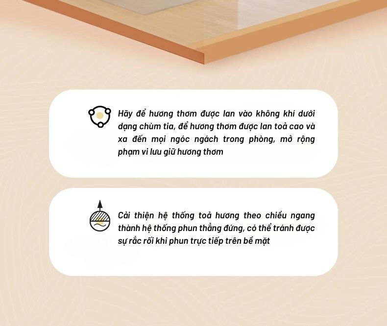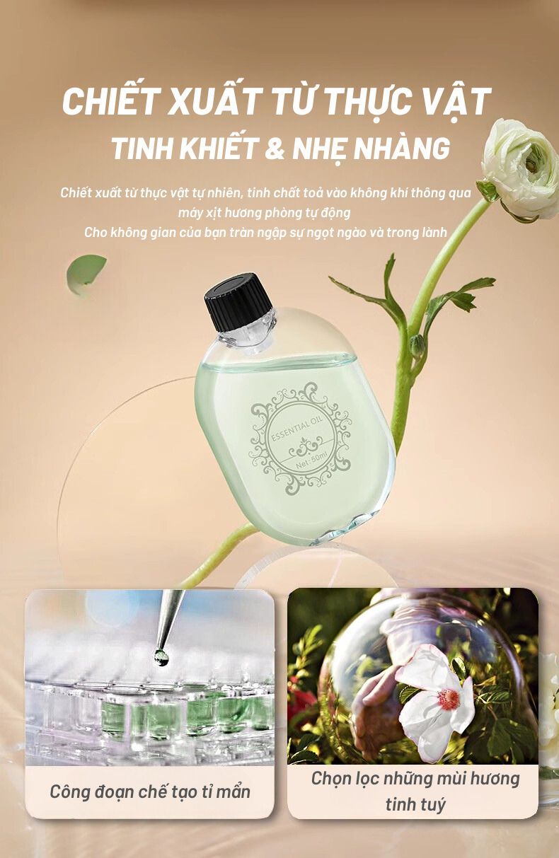 - KHÔNG sử dụng dạng tinh dầu công thức, nước hoa/tinh dầu dùng cho đèn xông tinh dầu vì sẽ gây ra tắc vòi xịt hoặc hỏng hóc máy.