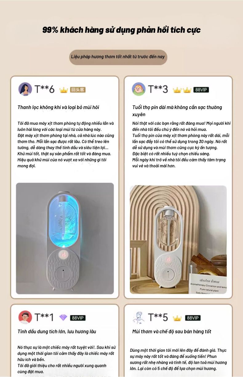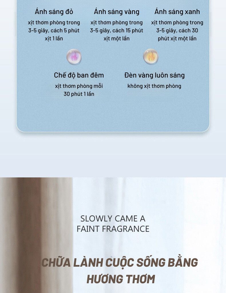 +Chế độ ban đêm (đèn 3 màu chuyển màu liên tục): xịt thơm phòng mỗi 30 phút 1 lần