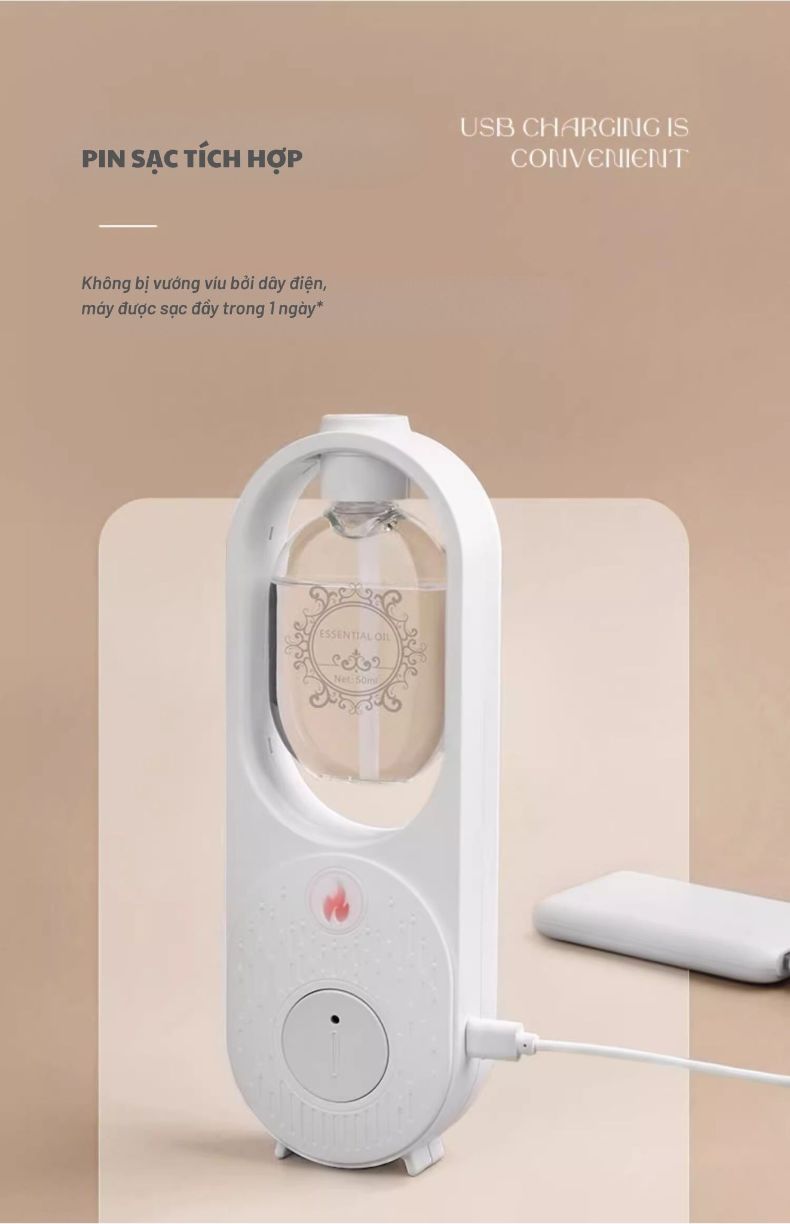 Thời lượng pin của máy xịt thơm phòng tự động lên đến 30 ngày nên bạn không cần lo lắng về việc thay pin liên tục. Cổng sạc USB tích hợp cũng mang lại sự tiện lợi khi bạn cần sạc lại máy. Thời gian lưu hương phụ thuộc vào chế độ xịt và thông gió của phòng, đảm bảo rằng mọi góc nhỏ trong không gian của bạn đều thơm mát và thoải mái.