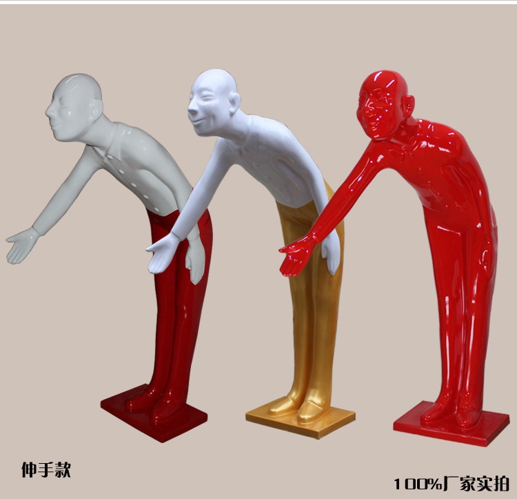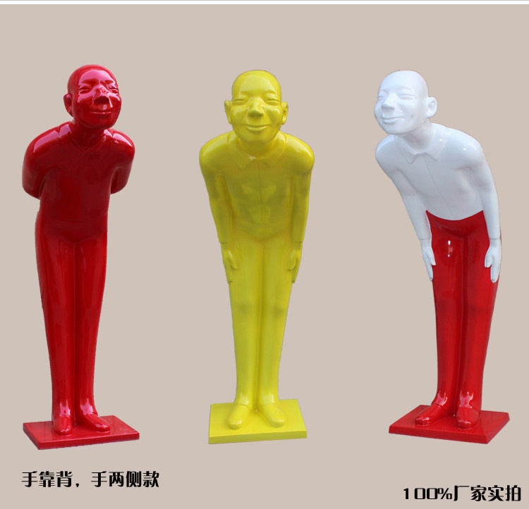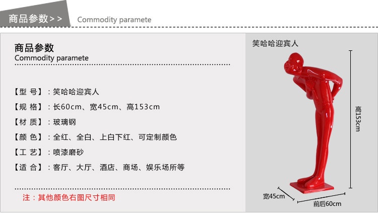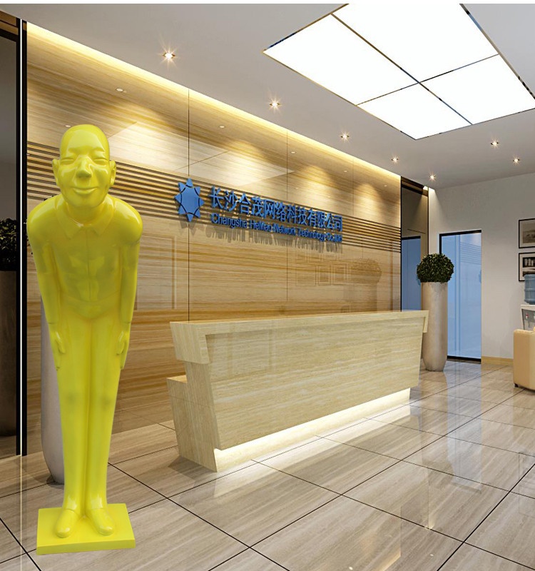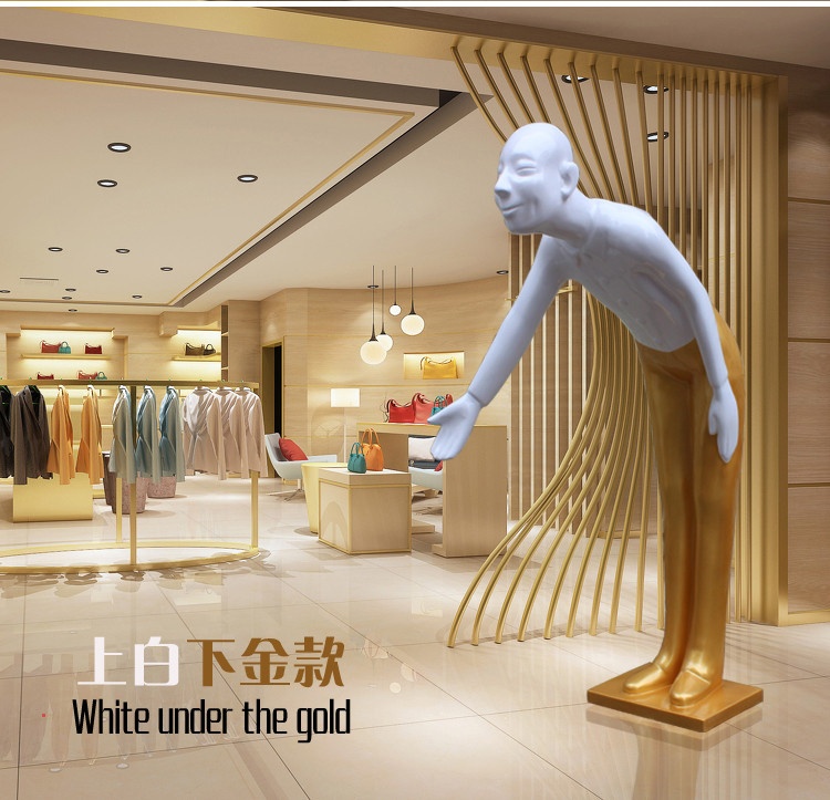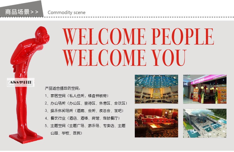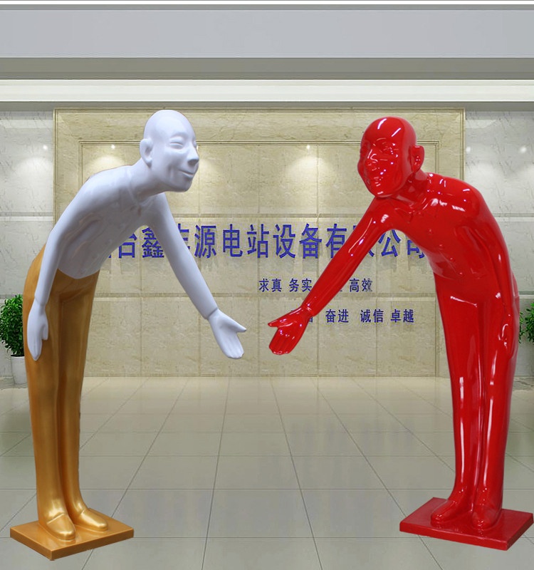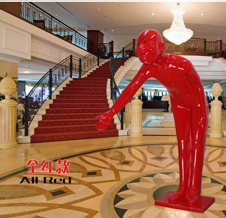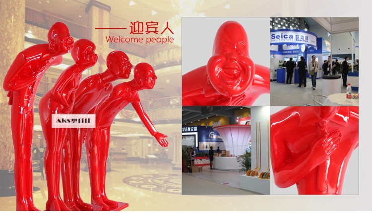 Tượng chào mừng hình người có ba màu cơ bản trắng, vàng và đỏ giúp khách hàng dễ dàng phân biệt và nhận biết ở nơi đông người. Tượng được thiết kế tinh tế với hình người đang cúi chào khách hàng tượng trưng cho thông điệp khách hàng luôn là thượng đế, tạo ấn tượng tốt từ lúc khách hàng mới bước chân vào cửa. Động tác cúi chào khách hàng thể hiện được rõ quan điểm cũng như sự tiếp đãi nhiệt tình của cửa hàng.