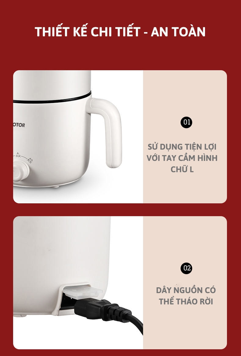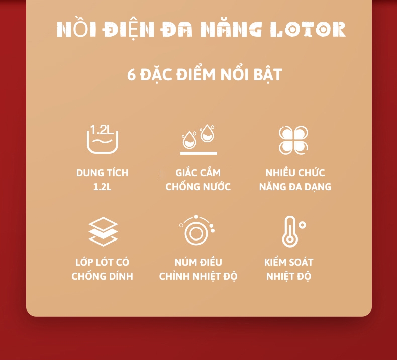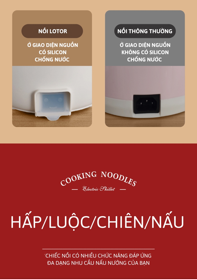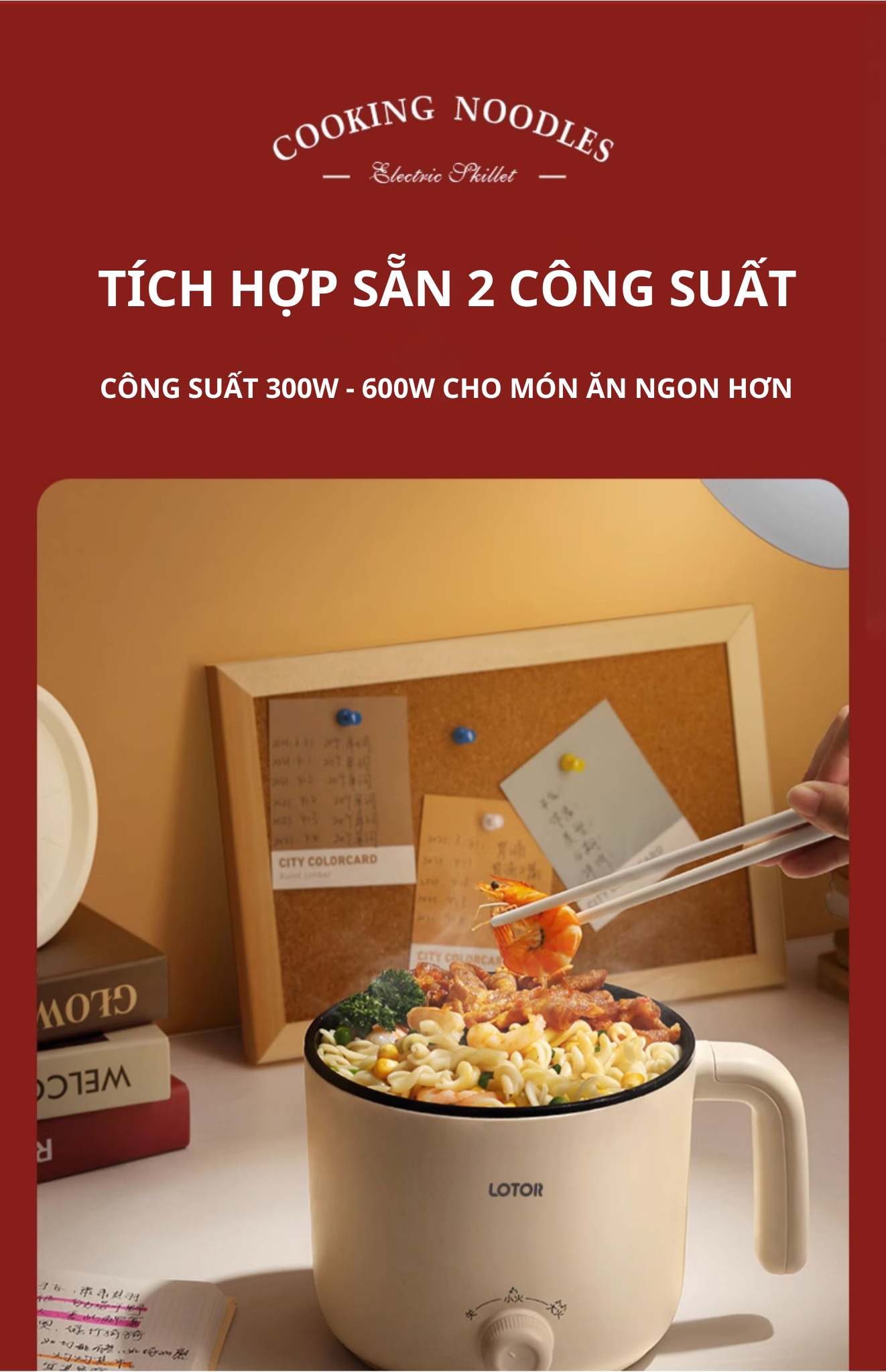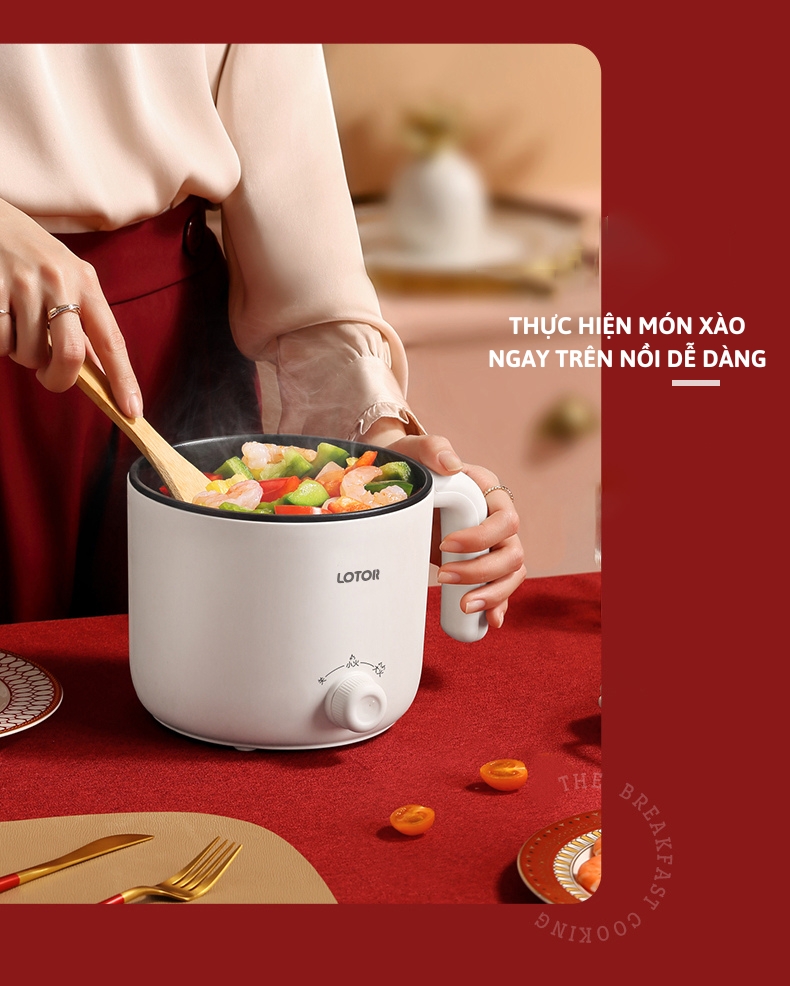 Sản phẩm nồi điện đa năng Lotor vừa có khả năng giúp bạn tiết kiệm thời gian công sức, vừa giúp bạn tiết kiệm nhiên liệu tối đa. Có thể dùng để nấu lẩu, nấu canh chỉnh lửa nhỏ hoặc to tùy ý và rất an toàn vì có thiết bị điều chỉnh nhiệt. Với phụ kiện xửng hấp bạn có thể hấp trứng và bánh trong vòng 5 phút là có thể có món ăn ngon, lại giàu dinh dưỡng, tiết kiệm được thời gian tối đa. Chế biến những món ăn ngon trong thời gian ngắn nhất, là sản phẩm tiện dụng không thể thiếu trong gia đình, văn phòng, các bạn học sinh, sinh viên…