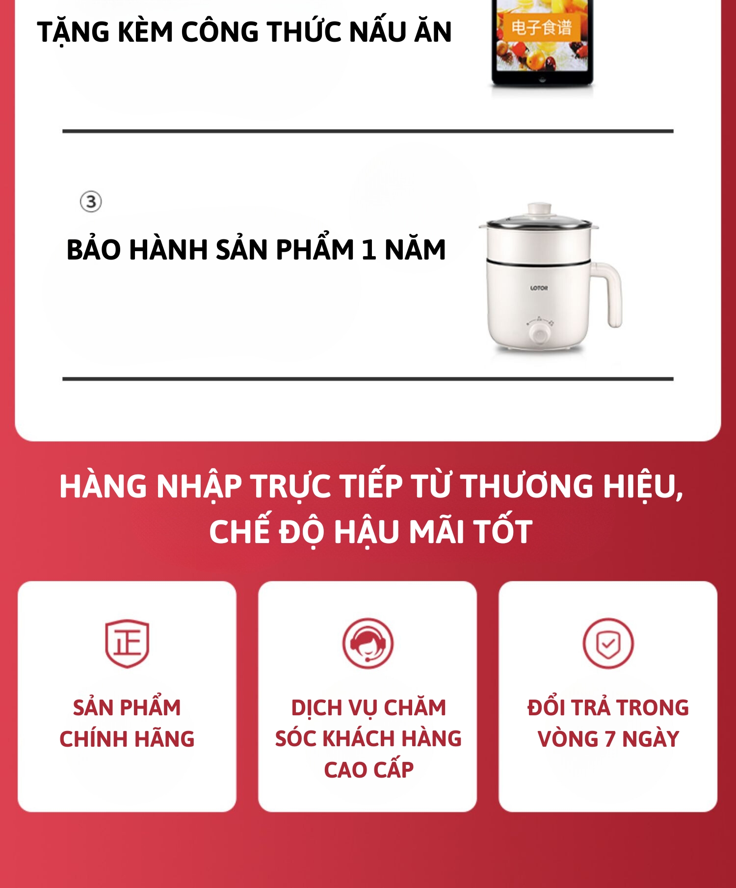 Nồi điện đa năng Lotor 1.2L được bảo hành trong vòng 1 năm kể từ thời điểm bạn nhận được hàng. Trong thời gian này, nếu bạn gặp bất kỳ vấn đề hoặc lỗi nào do nhà sản xuất, chúng tôi sẽ tiến hành sửa chữa hoặc đổi mới sản phẩm.