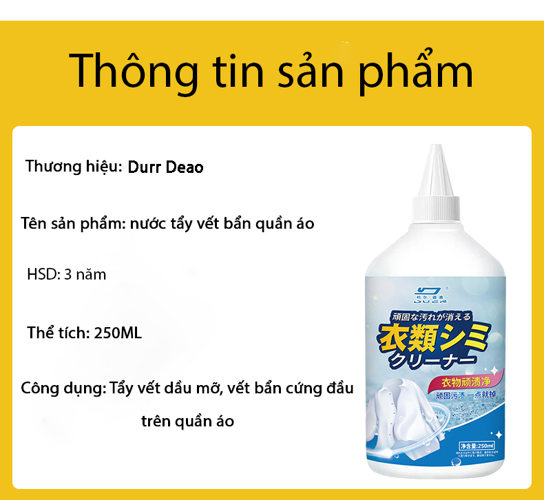 Nước tẩy vết dầu mỡ và vết bẩn cứng đầu Durr Deao là sản phẩm giúp loại bỏ các vết bẩn, dầu mỡ và các chất bám trên quần áo. Có một số công dụng chính của sản phẩm như sau:
