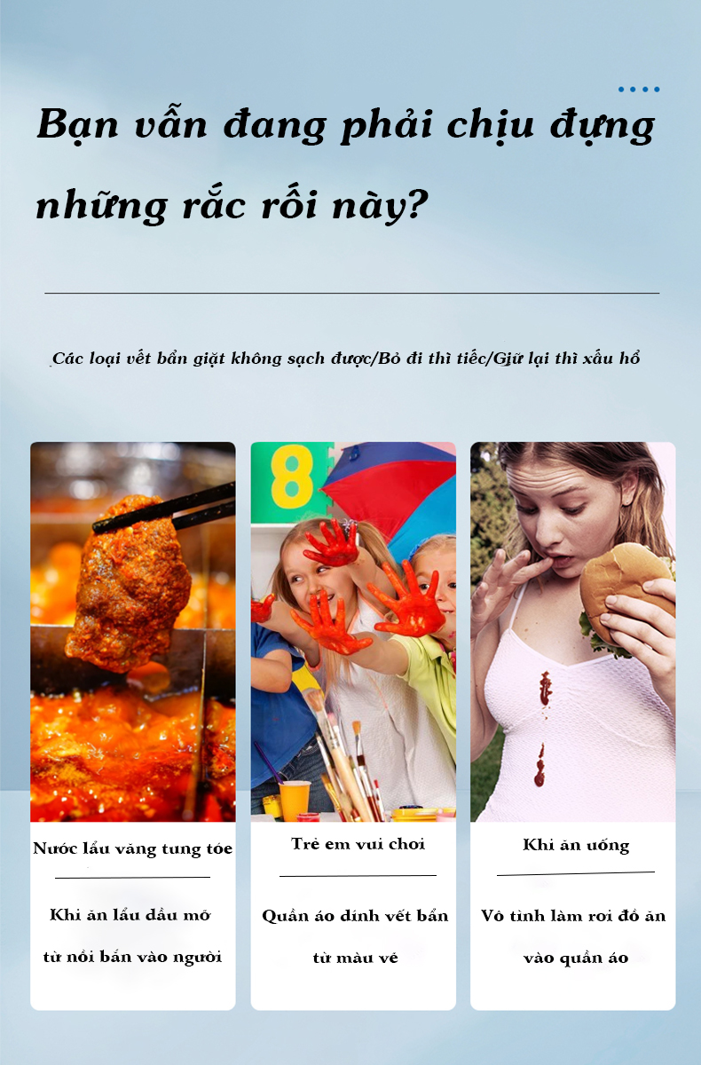Trong cuộc sống hàng ngày, việc trang phục của chúng ta bị dính những vết bẩn cứng đầu, vết dầu mỡ đã là chuyện không còn xa lạ. Một ngày đẹp trời, bạn phát hiện chiếc áo mình yêu thích bị dính vết bẩn mà không thể nào giặt sạch được. Hay những bộ đồ của con yêu mới mặc một hai lần đã dính đầy vết thức ăn, đồ uống, màu vẽ… Chỉ vì một vết bẩn mà bỏ quần áo đi thì tiếc, giữ lại mặc thì lại cảm thấy ngại ngùng, tự ti.