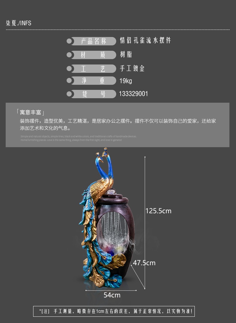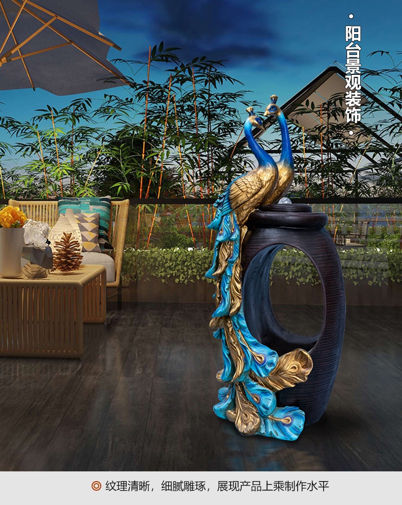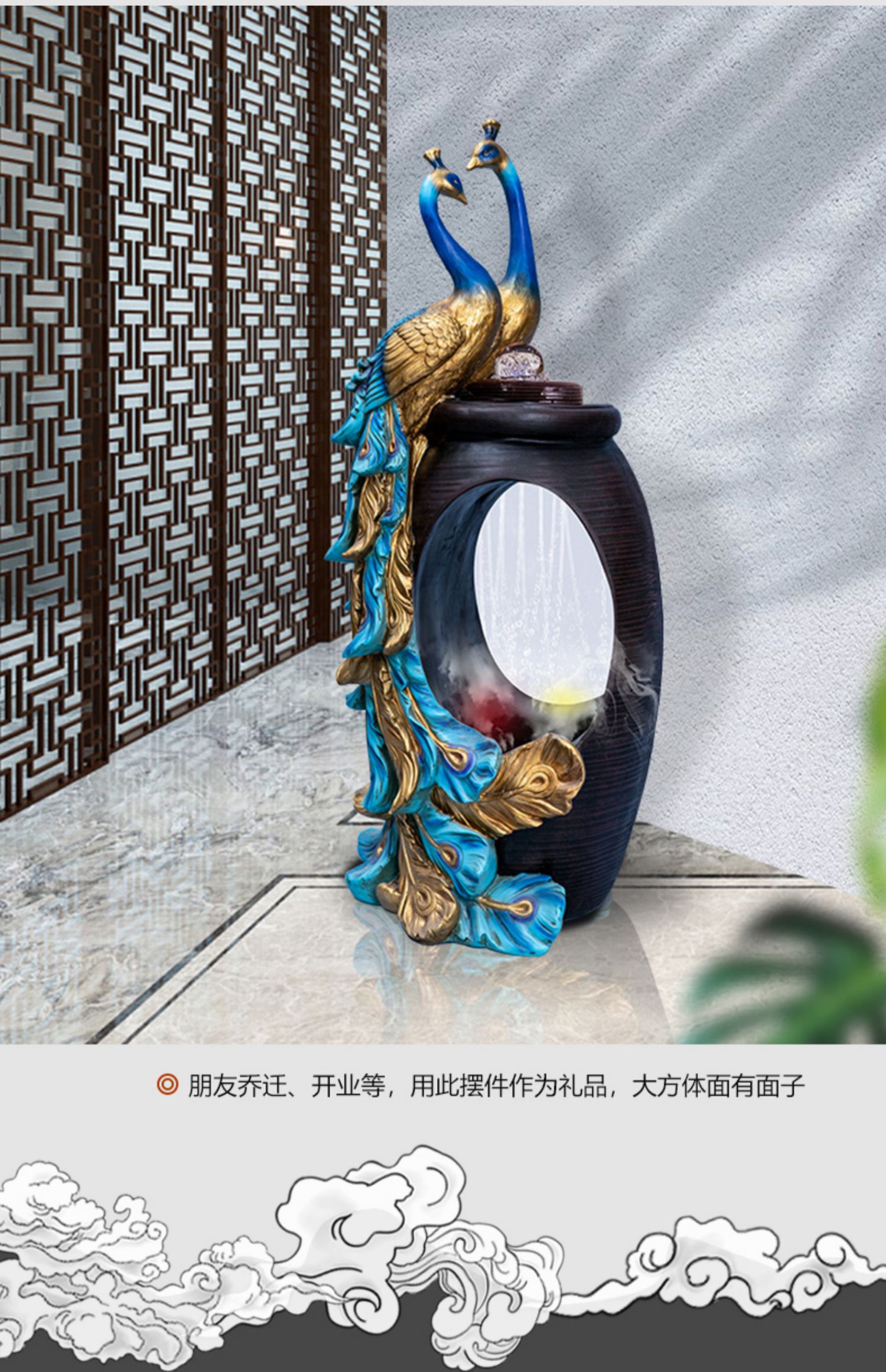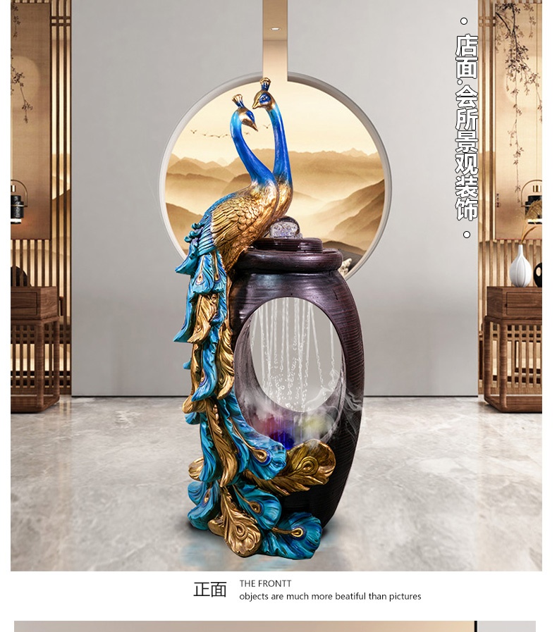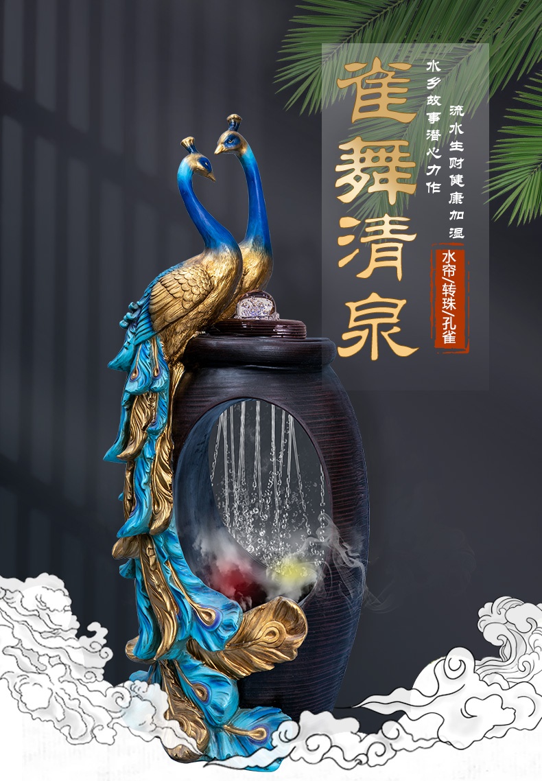 Thác nước được cách điệu, thiết kế hình oval ở giữa tạo sự uyển chuyển, mềm mại, tăng tính nghệ thuật cho sản phẩm. Phía dưới tích hợp hệ thống đèn led và đèn phun khói tạo sự huyền ảo, bồng bềnh chẳng khách gì chốn bồng lai tiên cảnh. Điểm nổi bật chính là đôi chim công đang quấn quýt bên nhau, thể hiện sự gắn bó, thủy chung son sắc. Đôi chim công được tạo hình uyển chuyển, các đường nét tinh xảo, mềm mại, màu sắc chân thật vô cùng sinh động.