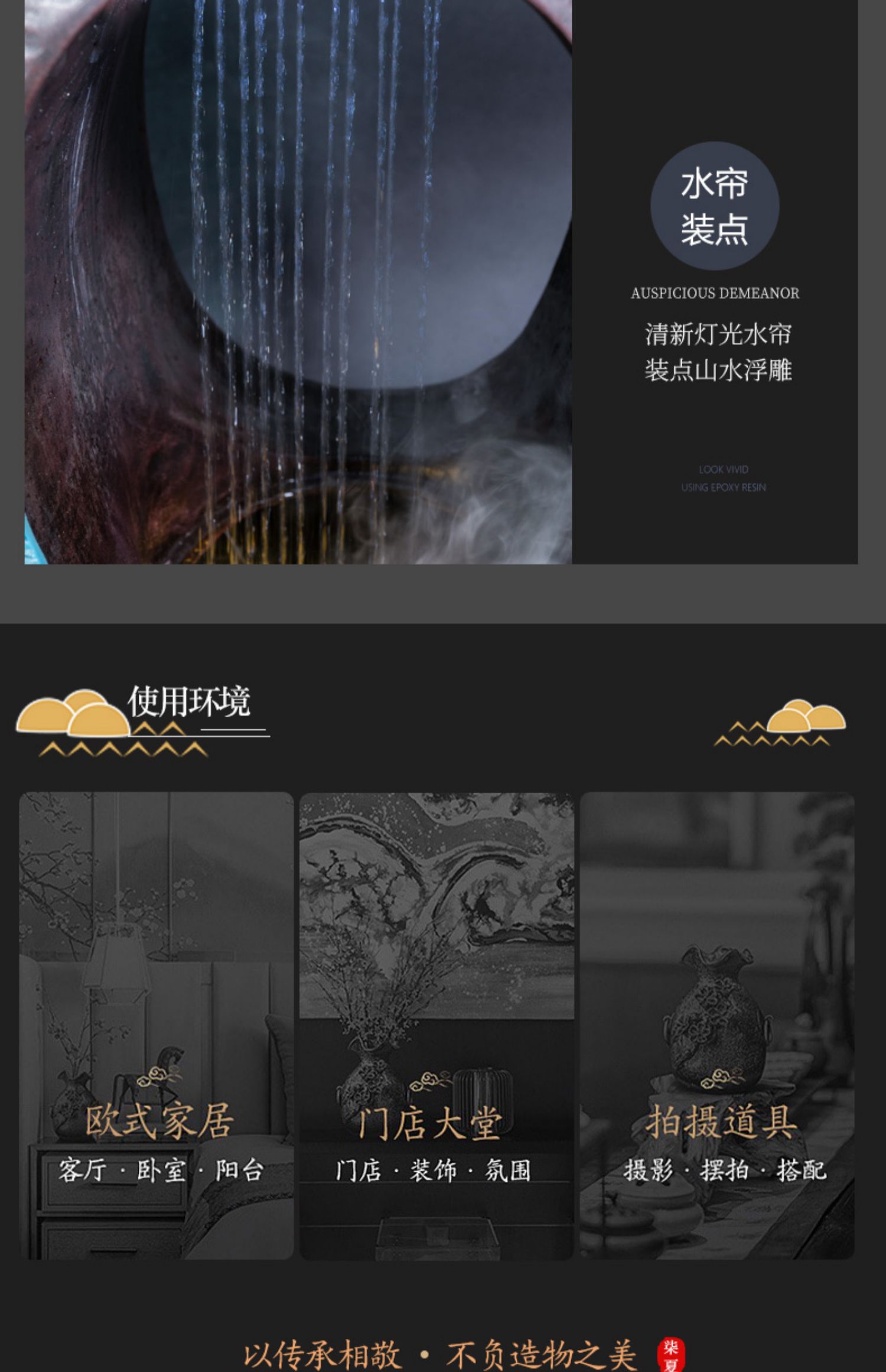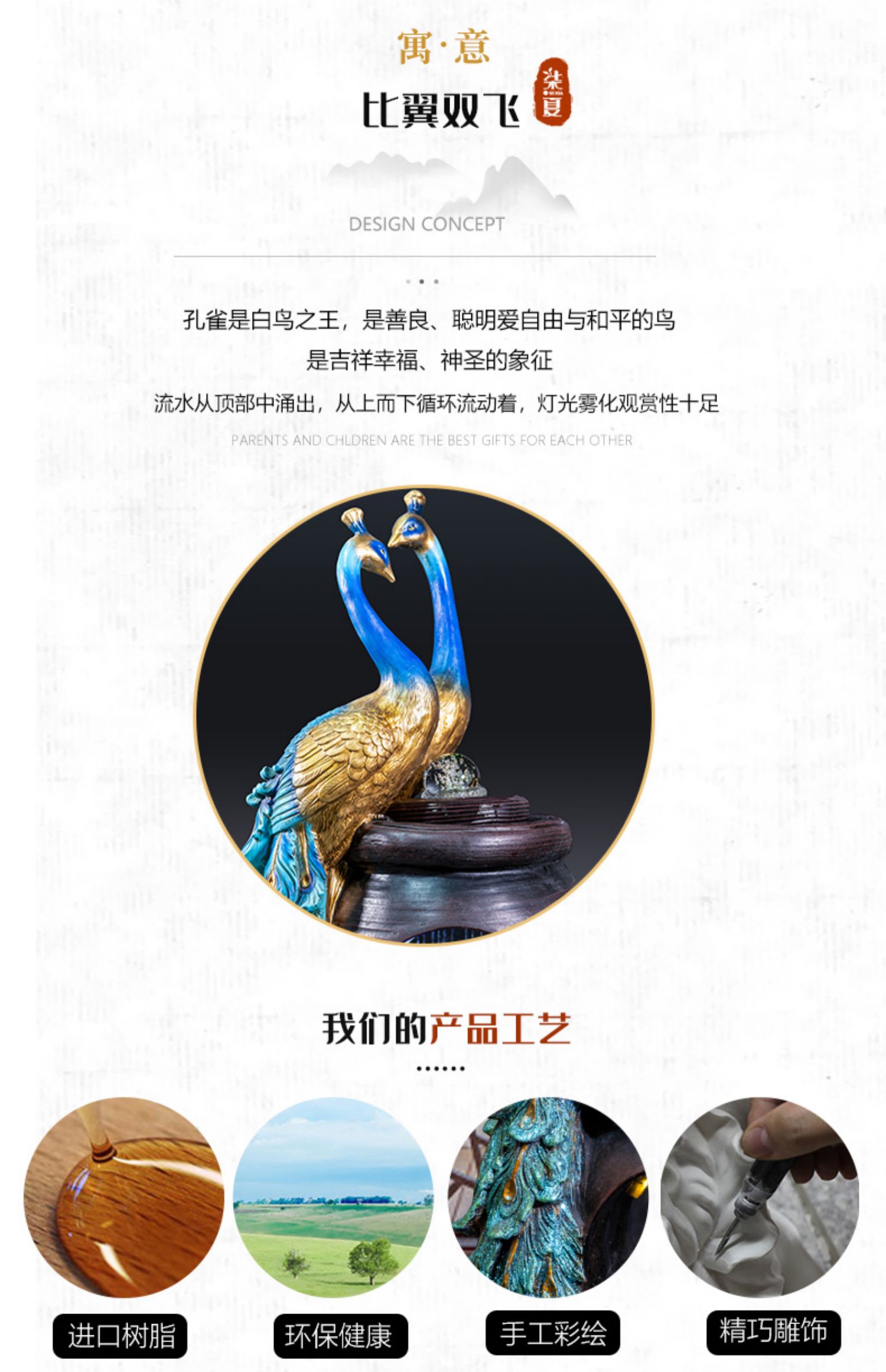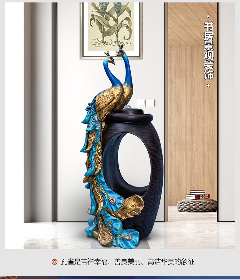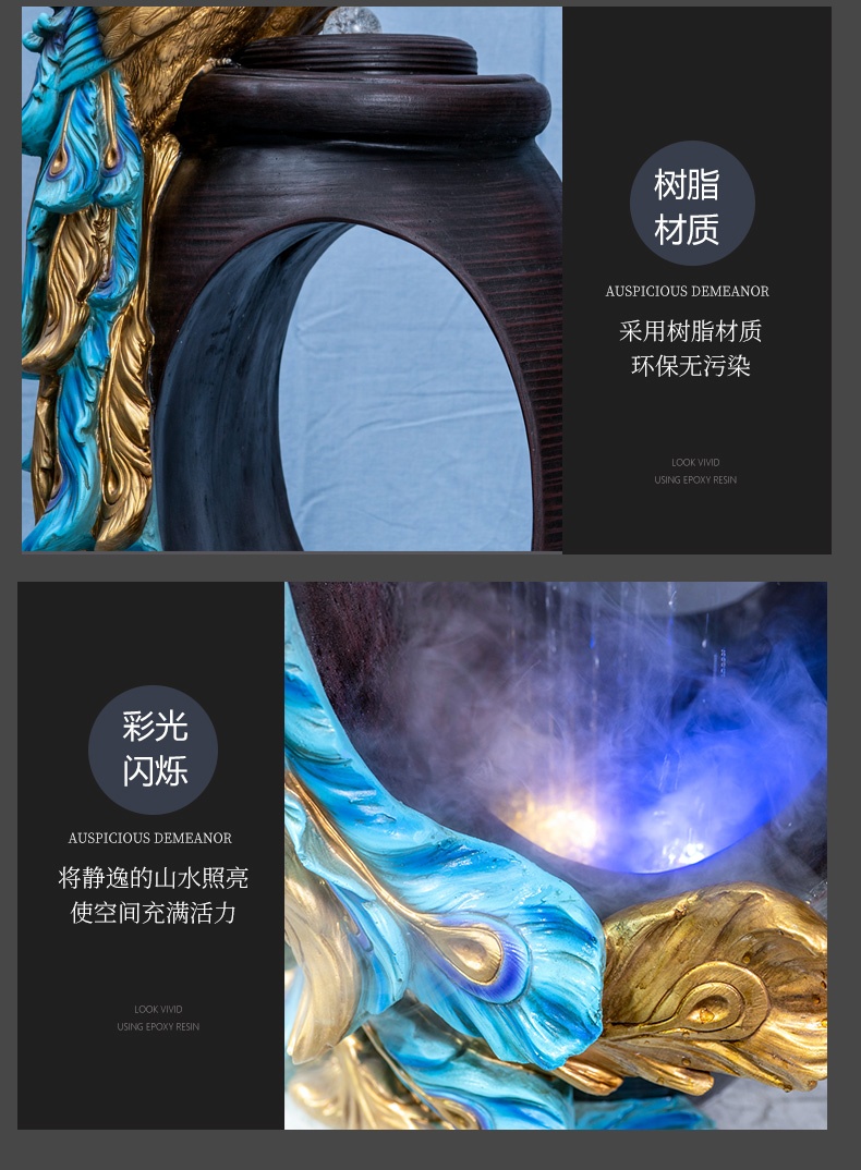 Thác nước được cách điệu, thiết kế hình oval ở giữa tạo sự uyển chuyển, mềm mại, tăng tính nghệ thuật cho sản phẩm. Phía dưới tích hợp hệ thống đèn led và đèn phun khói tạo sự huyền ảo, bồng bềnh chẳng khách gì chốn bồng lai tiên cảnh. Điểm nổi bật chính là đôi chim công đang quấn quýt bên nhau, thể hiện sự gắn bó, thủy chung son sắc. Đôi chim công được tạo hình uyển chuyển, các đường nét tinh xảo, mềm mại, màu sắc chân thật vô cùng sinh động.