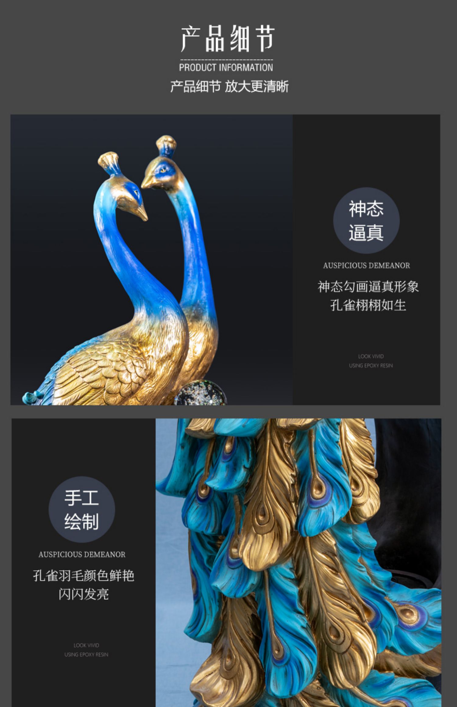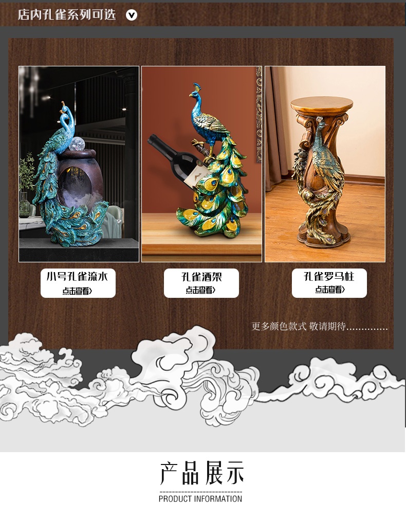 - Kích thước: Thác nước chim công lớn (Cao 125,5cm, rộng 54cm, dài 47,5cm), Tượng chim công nhỏ (Cao 52,5cm, rộng 29cm, dài 22cm).