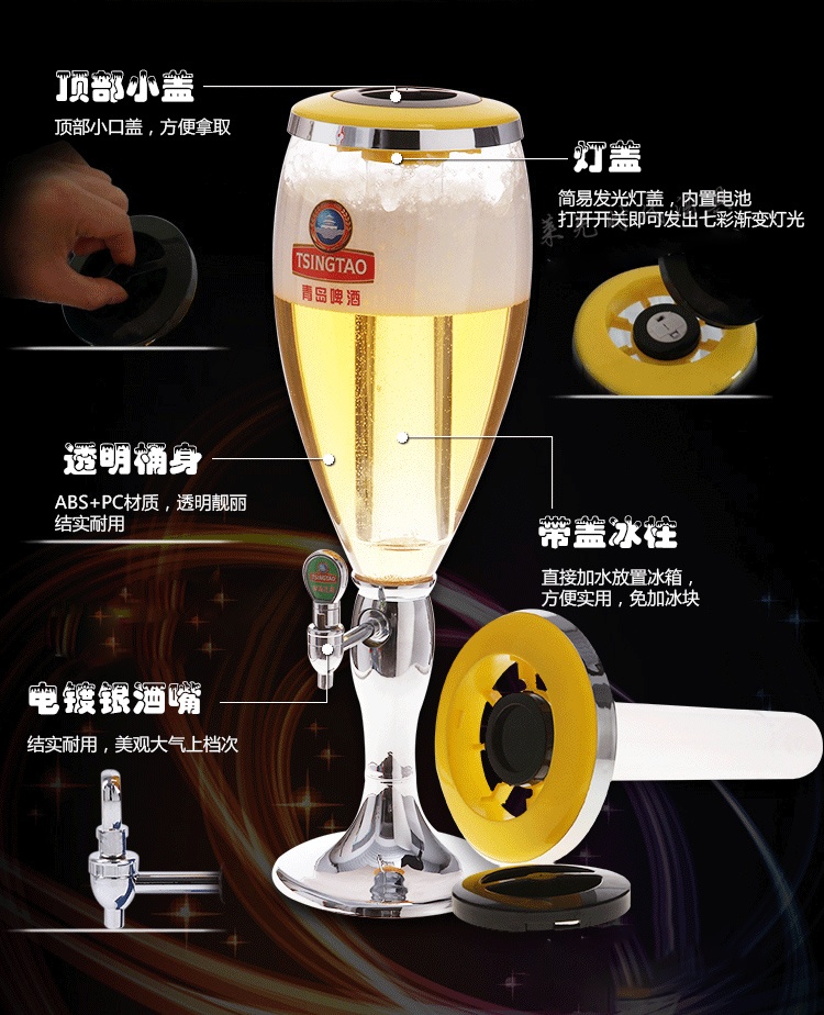 Phần vỏ phát sáng nhẹ, tích hợp pin và nút bật công tắc để phát ra đèn gradient nhiều màu sắc. Thân tháp đựng bia được làm bằng nhựa trong suốt cao cấp có tính bền bỉ giúp mọi người dễ dàng quan sát được dung tích bia bên trong. Phần vòi được mạ bạc điện bền, đẹp. Đặc biệt, sản phẩm có hệ thống làm lạnh tiện lợi và thiết thực nên bạn không cần thêm đá viên trong khi sử dụng.