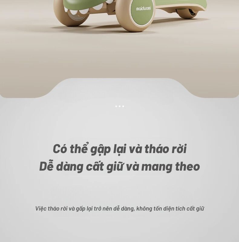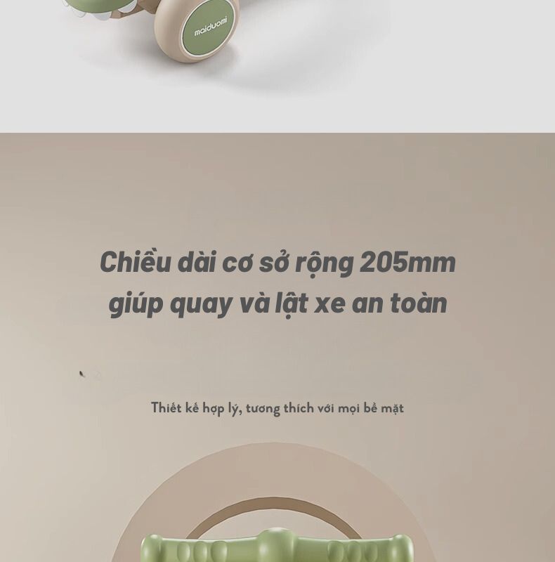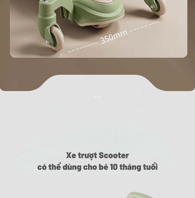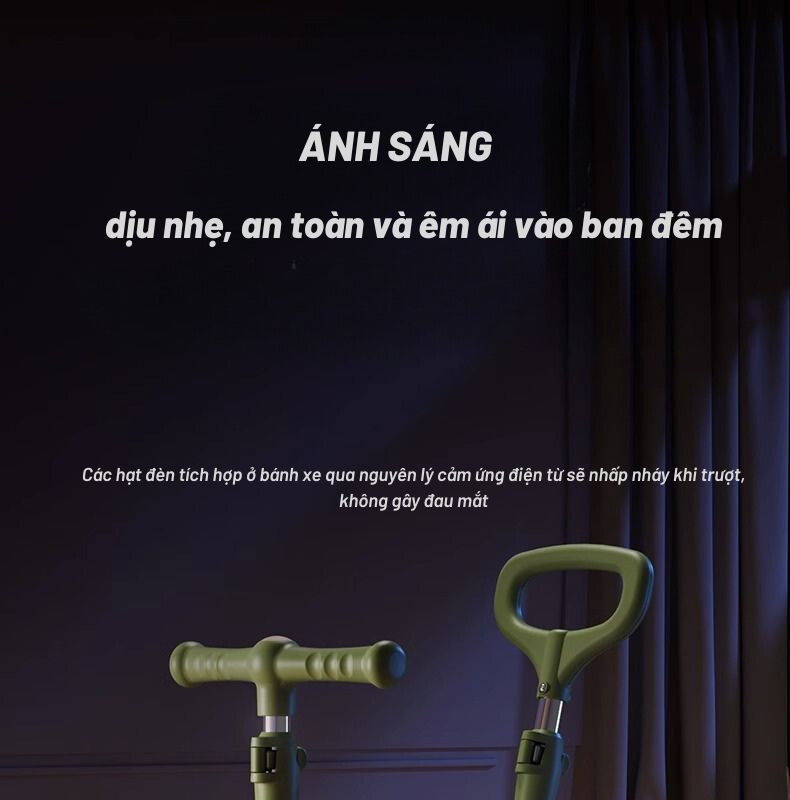 Bánh xe lớn và đèn phát sáng: Bánh xe lớn của xe trượt bám dính mọi địa hình, giúp bé dễ dàng di chuyển một cách mượt mà và an toàn. Đặc biệt, đèn phát sáng vĩnh cửu trên bánh xe tạo thêm sự hấp dẫn cho bé khi di chuyển, giúp tăng khả năng nhận diện trong điều kiện thiếu sáng.
